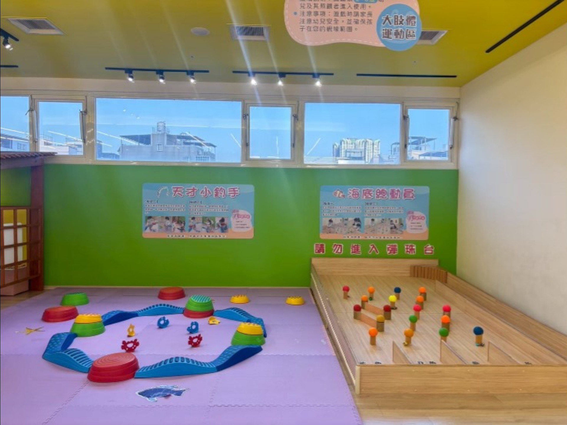- 各空間以分齡分區設計,提供0-2歲及2-6歲安全遊戲空間以及刺激幼兒身心及感官發展的教玩具,其中,更將傳統的菜市場或柑仔店等設置於館內,讓幼兒以角色扮演或扮家家酒的方式體驗阿公阿嬤們的兒時生活。
